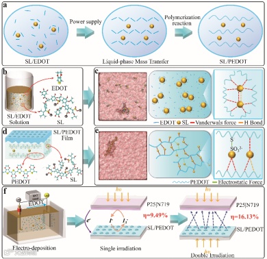 该制备工艺使用水溶液作为介质,EDOT作为单体,SL作为引发剂和表面活性剂。电沉积过程中,SL诱导EDOT单体合成PEDOT涉及三个关键过程:液相传质、电荷转移和聚合反应。在此过程中,液相传质和电荷传递同时发生。在SL/EDOT水溶液中,EDOT分子之间的弱相互作用促进了良好的分散状态,有利于液相传质和EDOT单体在FTO表面的迁移。SL与EDOT分子之间较强的相互作用增强了SL从溶液中吸附游离EDOT分子的能力,从而增加了FTO(掺杂氟的氧化锡)表面上的EDOT单体的数量。SL的酚醌共振电荷转移和储存特性增强了电荷转移,使FTO附近的EDOT单体获得电子并形成PEDOT自由基。这一过程促进了均匀PEDOT膜的成功聚合(图2)。