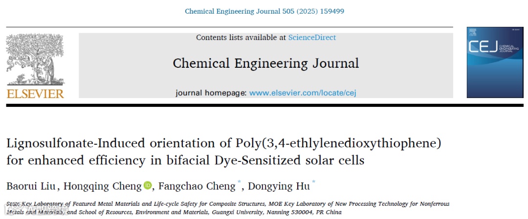 近日,来自广西大学的胡冬英副教授和程芳超副教授,在国际知名期刊Chemical Engineering Journal上发表题为“Lignosulfonate-Induced Orientation of Poly(3,4-ethlylenedioxythiophene) for Enhanced Efficiency in Bifacial Dye-Sensitized Solar Cells”的研究文章。该研究报道了通过电化学沉积的方法制备高效的木质素磺酸钠(SL)原位掺杂PEDOT电极。其中,SL诱导的PEDOT分子定向的CEs表现出低无序的取向分布和高氧化还原能力,实现了10.7%的高背光吸收,104 S/m的高电导率,优化了CEs的电子传递性能。SL/PEDOT CEs表现出优异的耐腐蚀性和较长的使用寿命,在运行500小时后,其初始效率保持在90%以上。此外,SL的加入增加了原始PEDOT中的电子传递位点,使得短路电流密度从21.49 mA/cm2增加到29.03 mA/cm2。SL/PEDOT组装的DSSCs在单侧和双侧照射下的PCE值分别达到9.49%和16.13%,超过了之前报道的许多双面DSSCs。我们的策略可能为实现高效的双面DSSCs提供了一个新思路。