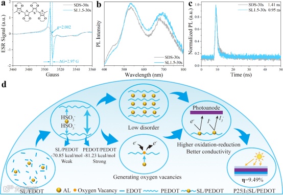 Figure 3 Mechanism of SL/PEDOT CEs in DSSCs: a) ESR spectra of SDS-30s and SL1.5-30s; b) Steady-state PL spectra of perovskite layers in SDS-30s and SL1.5-30s; c) TRPL decay profile of the perovskite layer on SDS-30s and SL1.5-30s, d) Hole-carrier mechanism.