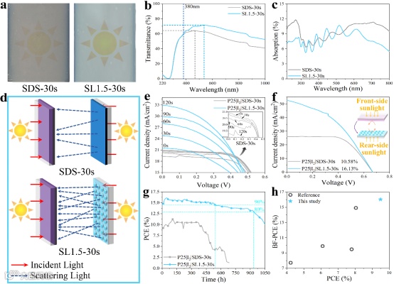 Figure 6 Evaluation of SL/PEDOT CEs in bifacial DSSCs: a) Optical images of SDS-30s and SL1.5-30s; b) Transmittance spectra; c) UV-vis absorption spectra; d) schematic of front and back irradiation; e) J-V curves of DSSCs over 0-120 s; f) J-V curves of bifacial DSSCs; g) PCE curves over time; h) Comparative analysis of bifacial P25|I2|SL1.5-30s with other reported bifacial DSSCs.