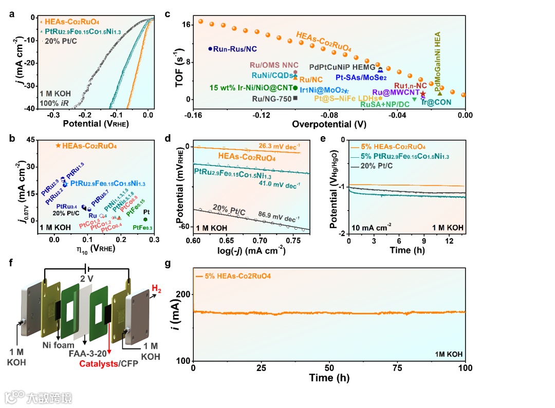 探究了HEAs在不同酸碱条件下的CV活化过程,发现只有在酸性条件下,CV活化曲线才会显示Ru物种的氧化峰。并且在0.1M HClO4中进行CV活化后,HEAs-Co2RuO4具有优于20% Pt/C和其他自制催化剂的碱性HER活性(图3a)。此外,对比了HEAs-Co2RuO4与其他催化剂的η10和周转频率(TOF)(图3c),正如所证明的那样,HEAs-Co2RuO4在1M KOH中的性能优于大多数以前报道的碱性HER的HEA和贵金属基催化剂。HEAs-Co2RuO4的塔菲尔斜率为26.3 mV·dec-1(图 3d)表明塔菲尔步(2H*→H2+2*)作为碱性HER对HEAs-Co2RuO4的速率决定步。此外,在流通池系统中进行HEAs-Co2RuO4的电催化HER,以研究在工业中的潜在应用(图3f),100小时内的直线i-t曲线(图3g)表明在膜电极组装系统下具有良好的碱性HER稳定性。