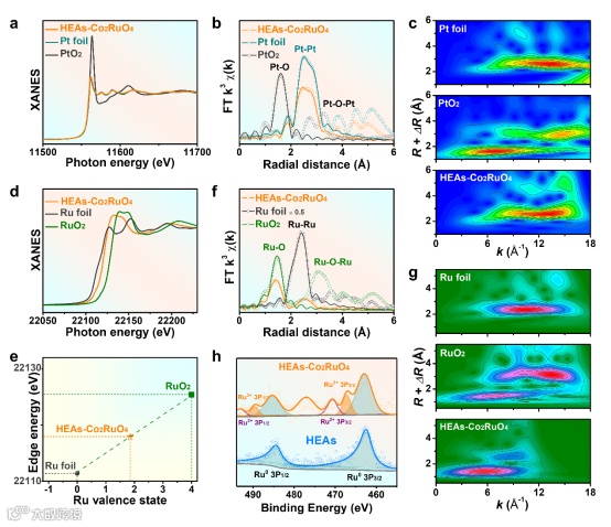 图2.活化前后的结构和表面特性。HEAs-Co2RuO4、Pt箔和PtO2的(a)XANES光谱,(b)EXAFS光谱和(c)小波变换。(d)XANES光谱,(e)Ru吸收能和价态之间的关系,(f)EXAFS傅里叶,以及(g)HEAs-Co2RuO4、Ru箔和RuO2的小波变换剖面。(h)PtRu2.9Fe0.15Co1.5Ni1.3 HEAs和HEAs-Co2RuO4的Ru 3p XPS谱图。
