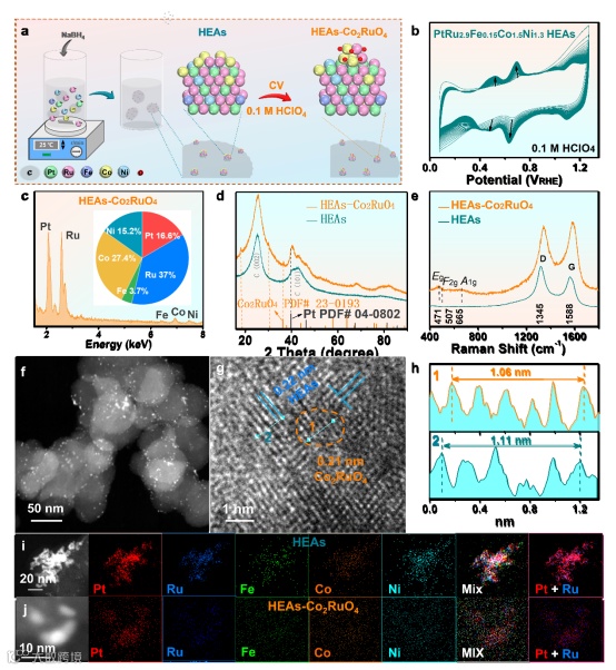 图1.合成示意图和表征。(a)HEAs-Co2RuO4的合成示意图。(b)CV曲线。(c)EDS。(d)XRD(e)拉曼光谱。(f)HAADF-STEM,(g)HRTEM (h)线扫描强度分布。(i)和(j)HAADF-STEM-EDS元素映射图像。