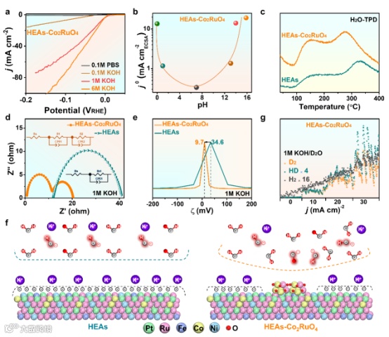 图4.(a)HEAs-Co2RuO4在不同电解液中的LSV、(b)pH和j0的相关性图。HEAs和HEAs-Co2RuO4的(c)H2O-TPD曲线,(d)−0.04 VRHE处的奈奎斯特图、(e)Zeta电位和(f)在KOH溶液的质子转移界面示意图。(g)HEAs-Co2RuO4在1M KOH/D2O中催化的碱性HER产物的在线质谱。