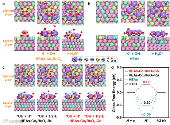 在DFT计算中,为了更好地模拟碱性HER反应,我们计算了水合K+的吸附能,水合K+物种更易于吸附在HEA(111)表面,而不是HEAs-Co2RuO4的Co2RuO4上(图5a)。随后,研究了HEAs-Co2RuO4和具有水合K+物质的HEAs表面的H2O吸附和解离,发现PtRu2.9Fe0.15Co1.5Ni1.3 HEAs中的H吸附位点位于合金表面的Ru位点,而HEAs-Co2RuO4中的H吸附位点是HEAs-Co2RuO4中Co2RuO4的Ru2+或Co3+(图5c)。这些结果表明,HEAs-Co2RuO4界面可以提高H2O吸附能力,削弱H吸附,从而加速碱性HER。