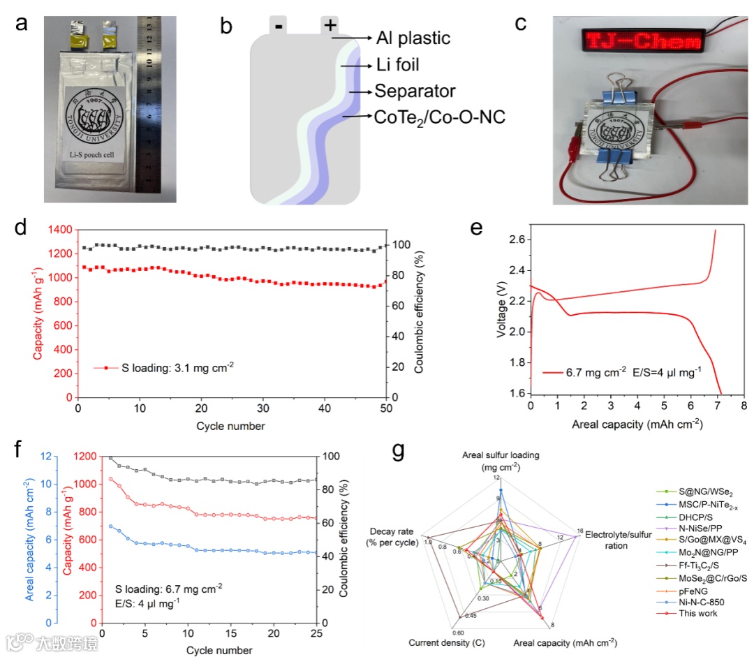 图5. S/ CoTe2/Co-O-NC阴极Li─S软包电池的电化学性能。Li─S袋软包电池的a、c) 照片,b) 示意图。d,f) 0.1 C下Li-S软包电池的循环稳定性。e) 0.1 C下的充放电曲线。g) 该研究中软包电池的性能与以往报道的比较。