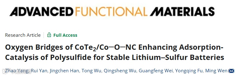 近日,来自同济大学化学科学与工程学院温鸣教授团队,在国际知名期刊Advanced Functional Materials上发表题为“Oxygen Bridges of CoTe2/Co-O-NC Enhancing Adsorption-Catalysis of Polysulfide for Stable Lithium–Sulfur Batteries”的观点文章。该观点文章开发了一种纳米结构的CoTe2/Co-O-NC电催化材料,以实现多硫化锂(LiPSs)的有效吸附和双向催化转化。研究结果表明,CoTe2/Co-O-NC中形成的氧桥(Co-O-C)不仅能有效地将钴的d带中心移至费米水平附近,从而增强对多硫化锂的吸附,还能增强CoTe2/Co异质结的内置电场,从而降低硫转化的能垒。此外,在充放电过程中,Li2S的沉积和解离显著增强,催化剂的耐久性明显提高,并构筑了纵横交错的多电子传输通道,实现了快速的跨界面电荷转移。合成的S/CoTe2/Co-O-NC阴极在0.1 C下的初始容量为1498 mAh g−1,在0.5 C下的500次循环容量衰减率仅为0.046%。在硫负载为6.7 mg cm-2,电解质/硫比为4 μL mg-1的情况下,阴极锂硫软包电池的能量密度为368 Wh kg-1,面容量为7.7 mAh cm-2。此方法也为其它高效异质结催化材料的设计提供了新思路。
