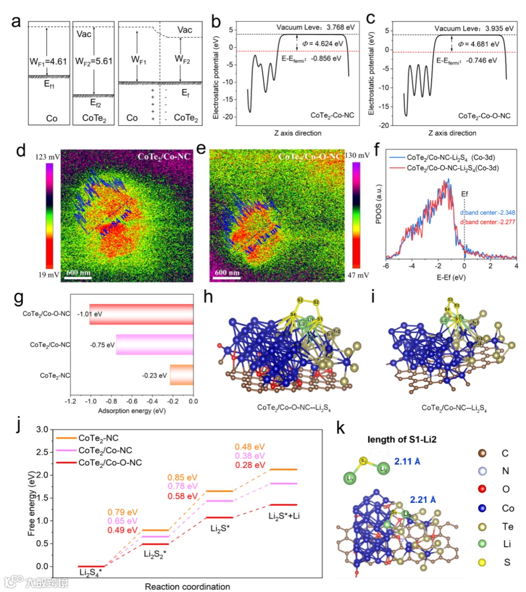 图6. a) CoTe2/Co结接触前后功函数变化示意图。计算出b) CoTe2/Co-NC和c) CoTe2/Co-O-NC的功函数。d、e) CoTe2/Co-NC和CoTe2/Co-O-NC的KPFM表面电位分布。f) CoTe2/Co-O-NC─Li2S4和CoTe2/Co─NC─Li2S4的Co3d轨道DOS结果。g) Li2S4在几种不同催化材料表面的Eads值。Li2S4在h) CoTe2/Co-O-NC和i) CoTe2/Co─NC表面的吸附构型。j) 氧化还原反应过程中自由能的变化。k) CoTe2/Co-O-NC基底上Li2S的S─Li键长。