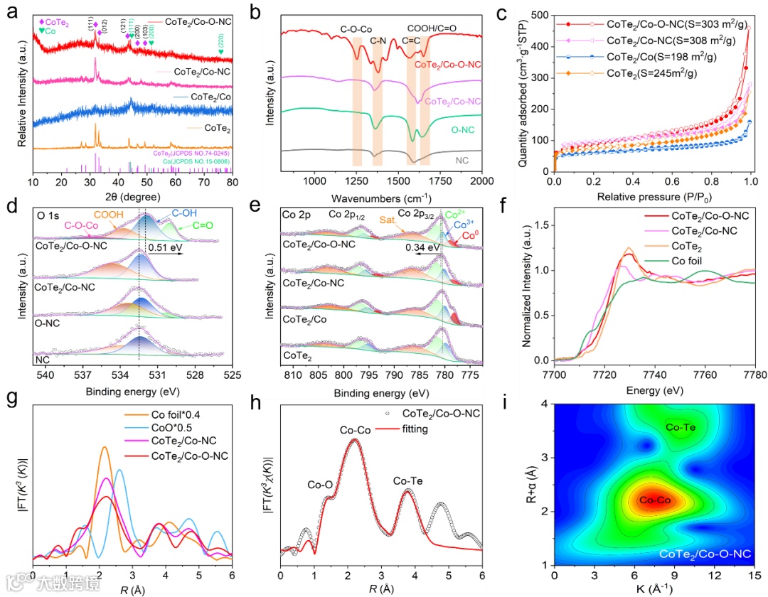 图2. a) 不同样品的XRD谱图。b) FTIR光谱。c) 不同样品的N2吸附-解吸等温线。不同样品d) O 1s和e) Co 2p的高分辨率XPS光谱。f) 归一化Co K边XANES光谱。g) Co K边的FT-EXAFS光谱。h) CoTe2/Co-O-NC R空间FT-EXAFS拟合曲线。i) CoTe2/Co-O-NC的WT-EXAFS分析。
