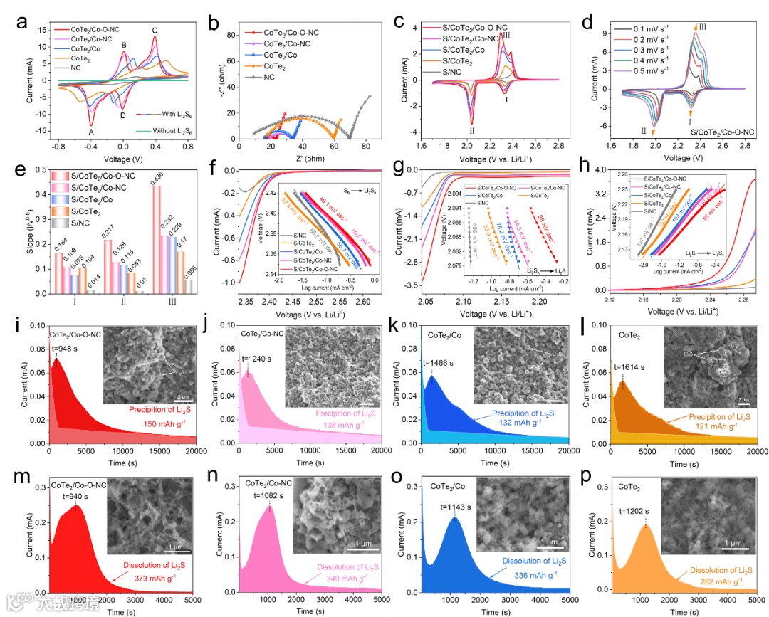 图3. a) 对称电池的CV曲线。b) 对称电池的Nyquist图。c) 0.1 mV s−1下不同阴极的CV曲线。d) 不同扫描速率下CoTe2/Co-O-NC的CV曲线。e) 锂离子扩散系数K值统计图。f-h) 塔菲尔图。i) CoTe2/Co-O-NC、j) CoTe2/Co-NC、k) CoTe2/Co和l) CoTe2基电池的Li2S成核实验。m) CoTe2/Co-O-NC、n) CoTe2/Co-NC、O) CoTe2/Co和p) CoTe2基电池的Li2S溶解实验。