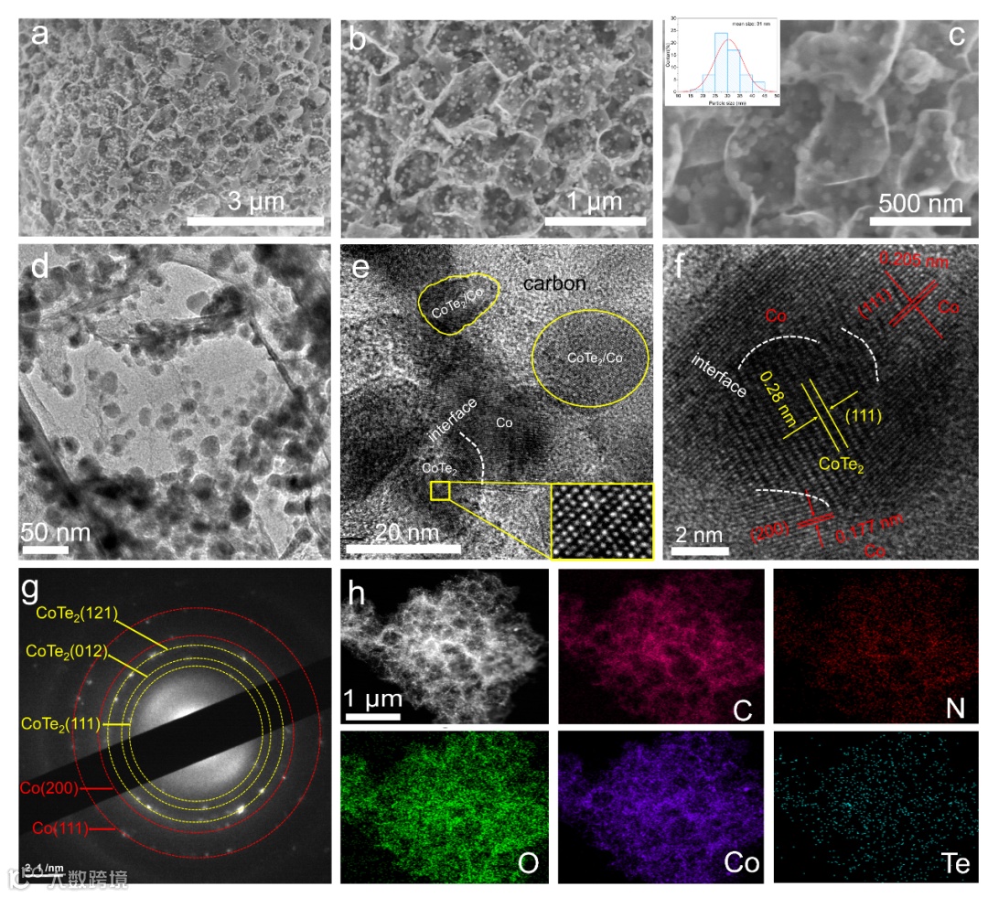 图1. a-c) CoTe2/Co-O-NC的SEM图像;插图中直方图显示了颗粒的直径分布。CoTe2/Co-O-NC的d) TEM图像,e,f) HRTEM图像,g) SAED模式,h) HAADF-STEM图像及相应的EDS元素映射。