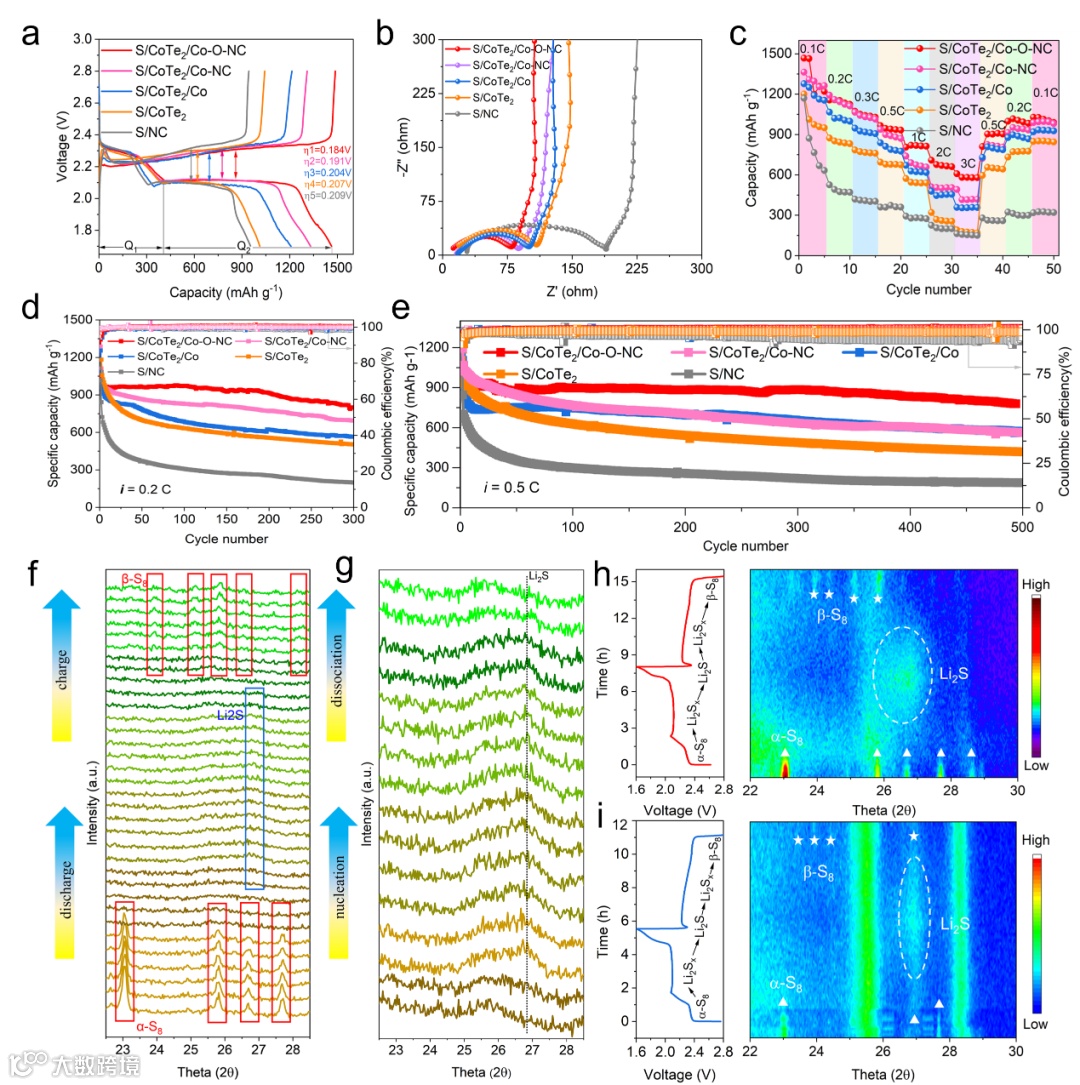 图4. a) 对应的GCD曲线。b) 不同阴极的奈奎斯特图。c) 倍率性能。d) 0.2 C和e) 0.5 C时不同阴极的长周期性能。f) S/CoTe2/Co-O-NC在0.1 C倍率下第一次循环的原位XRD图谱。g) 扩大了Li2S成核解离区S/CoTe2/Co-O-NC的原位XRD曲线。h) S/CoTe2/Co-O-NC阴极和i) S/CoTe2/Co-NC阴极的原位XRD等值线图。