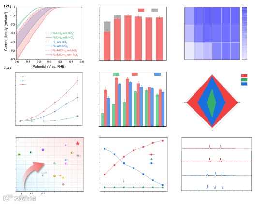 动力学同位素效应(KIE)研究表明,Ru-Ni(OH)2的平均KIE值低于Ru,表明Ni(OH)2有利于加速H2O解离,促进*H的形成。原位拉曼测试结果表明,与Ru相比,Ru-Ni(OH)2的强氢键结合H2O(4-HB·H2O)含量更低,而弱氢键结合H2O(2-HB·H2O)含量更高,表明Ni(OH)2有利于打破水之间的氢键网络,从而促进H2O的解离,为NO3的加氢转化提供质子。原位红外和原位电化学微分质谱检测NO3RR反应过程中的中间产物,推测反应路径为:*NO3→*NO2→*NO→*NOH→*N→*NH→*NH2→*NH3(图3)。
