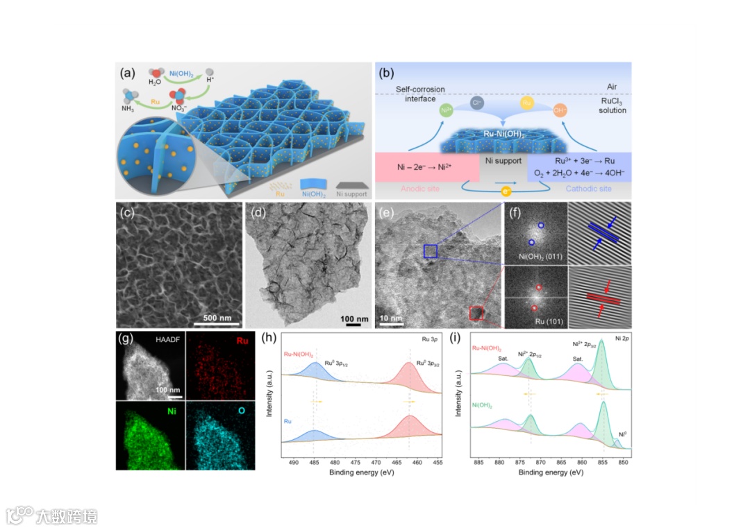 该工作采用了一种简单的自腐蚀策略,在金属镍基底上原位生长了Ni(OH)2纳米片阵列负载的金属Ru颗粒。在自腐蚀过程中,金属Ni被氧化为Ni2+;而在阴极侧,O2被还原为OH,Ru3+被还原为金属Ru。Ni2+进一步与OH结合形成Ni(OH)2,并且在其表面发生Ru颗粒的形核与生长。Ru-Ni(OH)2催化剂中Ru与Ni2+之间存在电子转移,有利于增加催化剂中的金属-载体相互作用(图1)。