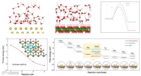 分子动力学(AIMD)模拟结果表明,金属氢氧化物的-OH会与界面水形成氢键,从而增强催化剂表面与界面水之间的相互作用,促进H2O参与NO3RR的加氢反应过程。密度泛函理论(DFT)计算表明,Ni(OH)2可以促进H2O的解离以及活性氢(*H)的产生。*H会发生自发的氢溢流过程,从Ni(OH)2转移到Ru,从而加速Ru位点上NO3加氢转化为NH3。与Ru和Ni(OH)2相比,Ru-Ni(OH)2的NO3RR反应路径中的各个中间产物能量更低,决速步骤的反应能垒仅为0.32 eV(图4)。