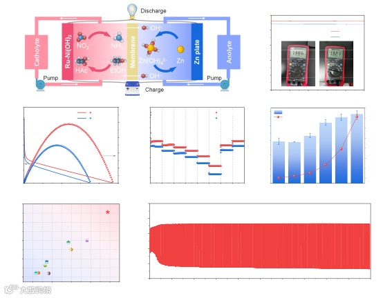 该工作进一步构筑了一种可充电式液流混合电池系统(图5)。其中Ru-Ni(OH)2和锌片分别作为正极和负极材料,中间用阴离子交换膜隔开。放电过程中,正极侧发生NO3RR反应生成NH3,而负极侧锌片发生氧化;而充电过程中,正极侧乙醇被氧化为甲酸,而负极侧Zn(OH)42重新被还原为金属锌。所组装的Zn- NO3/乙醇混合电池系统在充放电过程中具有良好的稳定性,同时在正极侧可以合成高附加值的甲酸铵。此外,乙醇可以替换为甲醇、异丙醇,证明了该策略的普适性。
