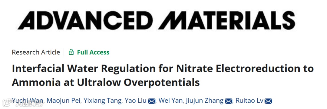 Yuchi Wan, Maojun Pei, Yixiang Tang, Yao Liu*, Wei Yan, Jiujun Zhang*, Ruitao Lv*, Interfacial Water Regulation for Nitrate Electroreduction to Ammonia at Ultralow Overpotentials. Adv. Mater. 2025, 2417696.