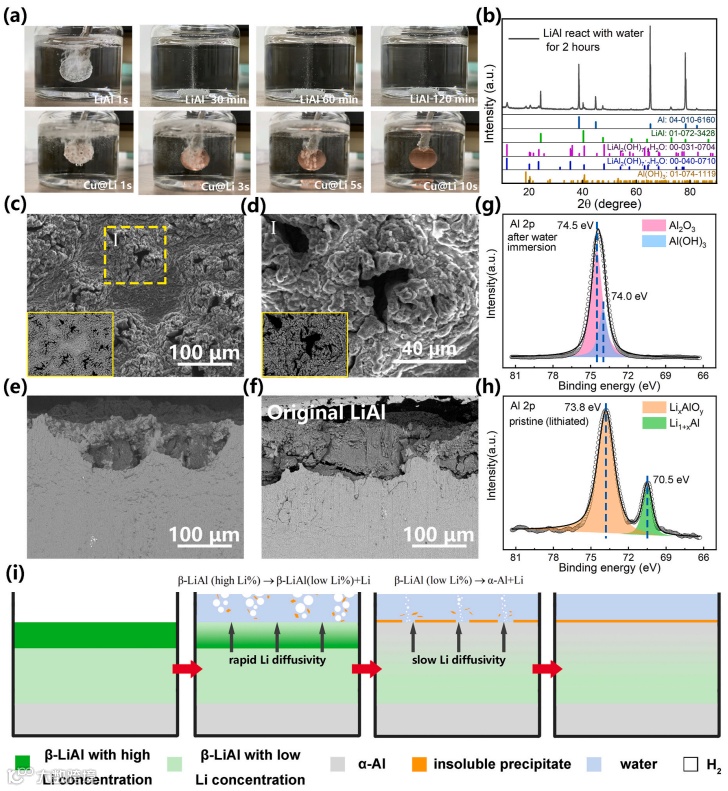 不同于Li金属与水的直接反应,由于Li原子在LiAl合金内部的固态扩散,其与水的反应包含高Li浓度β-LiAl合金(Li1+xAl)转变为低Li浓度β-LiAl合金(LiAl)、低Li浓度β-LiAl合金(LiAl)相变为α-Al的过程。由于脱锂相变为α-Al相的合金表面层扩散速率远低于β-LiAl相,合金内部未反应的β-LiAl相中Li原子向表面的扩散受到阻碍,被“捕获”于内部。这一过程减缓了LiAl合金表面与水的反应速率,为LiAl2(OH)7与Al(OH)3钝化膜的形成提供了条件,最终使LiAl合金与水的反应时间远高于有着相同Li含量的纯Li金属(本文采用电沉积了与LiAl合金相同容量的Cu@Li电极作为纯Li金属电极对照组)。