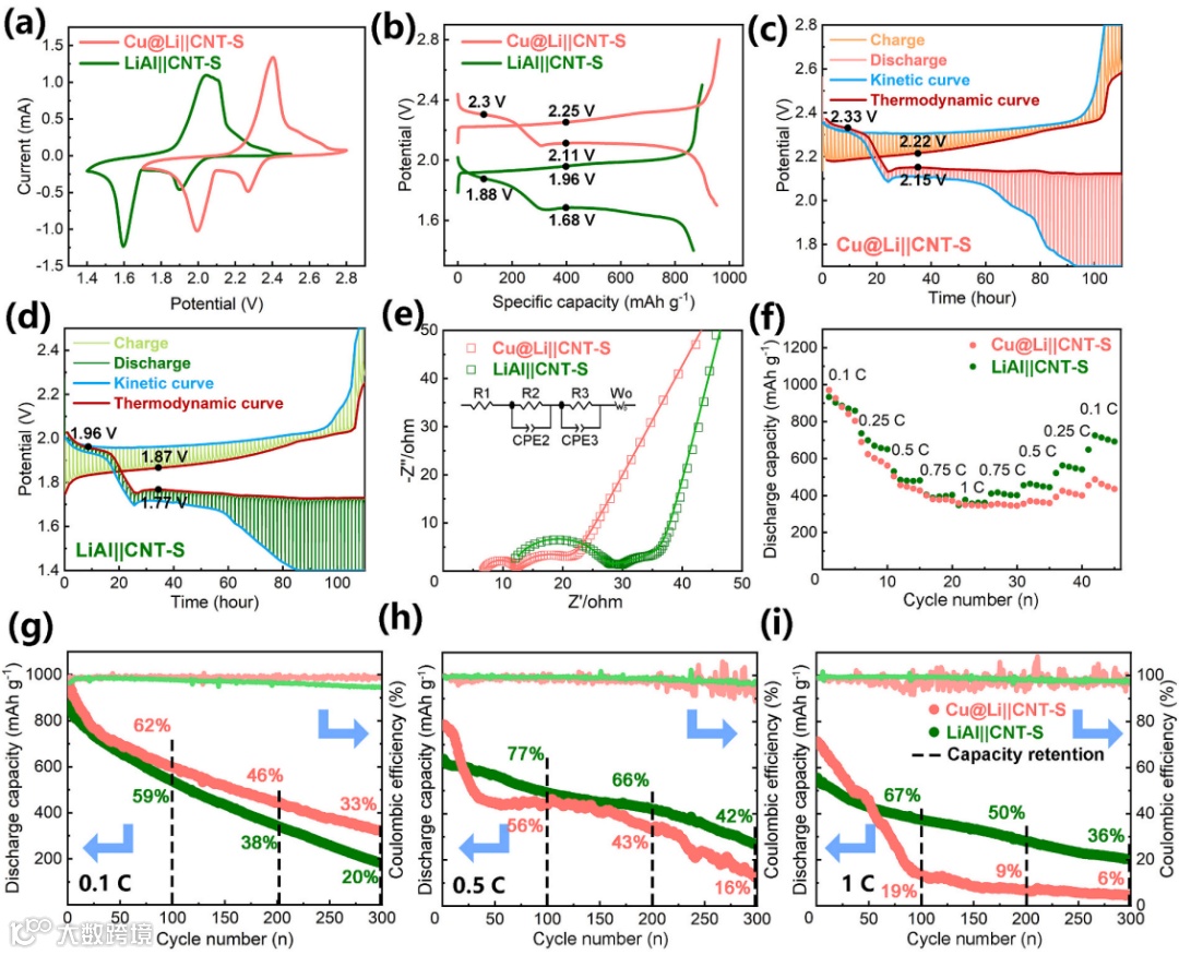 图3 LiAl||CNT-S与Cu@Li||CNT-S电池的电化学表征与性能