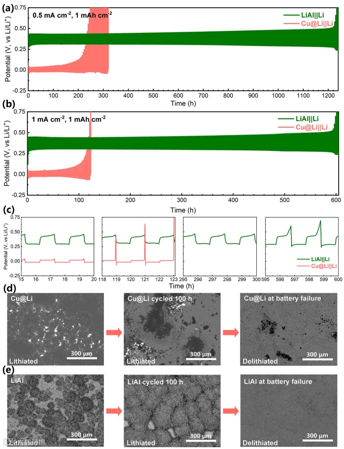 对Li金属负极而言,在长期循环过程中,枝晶和“死锂”问题是困扰电池安全及稳定性的关键因素。本文对比了相同Li沉积量下LiAl合金电极与纯Li金属电极(Cu@Li)在LiAl||Li和Cu@Li||Li半电池中的长期循环稳定性,并对循环过程中的电极的表面、截面形貌及成分进行表征。结果表明,由固态扩散控制的Li化/脱Li过程相比于直接的Li沉积/剥离过程更能遏制电极活性物质的损失。此外,循环过程中的合金化/脱合金化过程虽然最终导致了LiAl电极表面的粉碎与失活,但这种Li化/脱Li的方式从源头上消灭了枝晶产生的可能,在长期循环中为LiAl合金电极提供了远优于纯Li金属电极的循环稳定性与安全性。