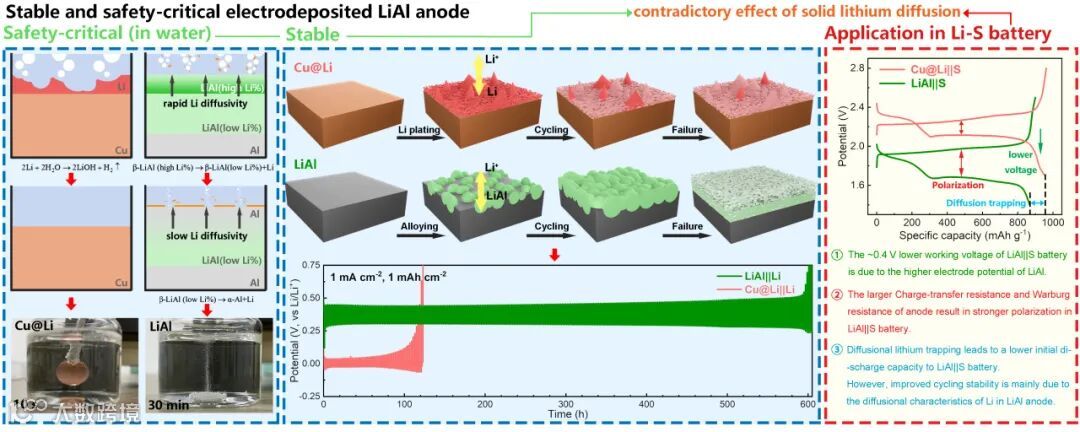 Graphical abstract β-LiAl+α-Al复合锂铝合金电极的遇水安全性,循环稳定性以及在LiAl||S全电池中的运行特点与成因