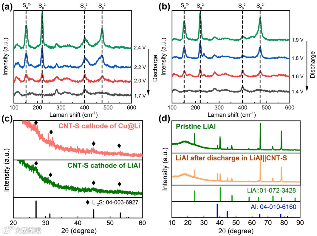 当与CNT-S正极配对时,LiAl||CNT-S电池的工作电压较传统LiS电池低约0.4 V,本文就这一改变的工作电压是否会影响LiAl||S电池中多硫化物的反应路径进行了研究。利用恒流间歇滴定技术、Raman光谱技术和X射线衍射分析等手段对LiAl||S电池的动力学/热力学电压曲线、反应过程中多硫化物的演变以及反应前后正负极的成分进行分析,本文进一步证明LiAl||S电池工作电压的变化是由LiAl电极自身较高的电极电位(0.34 V vs Li/Li+)导致的,其并未改变电池中多硫化物的反应路径,即LiAl负极中Li仍作为电极活性物质而Al仅作为Li的存储介质。