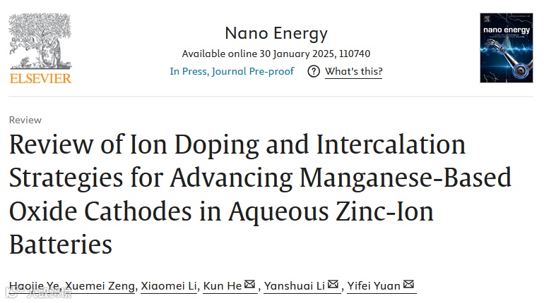 近日,温州大学袁一斐教授团队在国际知名期刊Nano Energy上发表题为“Review of ion doping and intercalation strategies for advancing manganese-based oxide cathodes in aqueous zinc-ion batteries”的综述文章。该综述文章聚焦于离子掺杂对于水系锌电池锰基材料的改性机理,从“提高导电性、增强电解液离子扩散动力学、改善结构稳定性、抑制锰溶解以及抑制不可逆惰性相生成”五个方面,详述离子掺杂对提高锰基材料电化学性能的原理与机制,以冀为推动水系锌电池锰基材料的进一步发展提供理论指导。