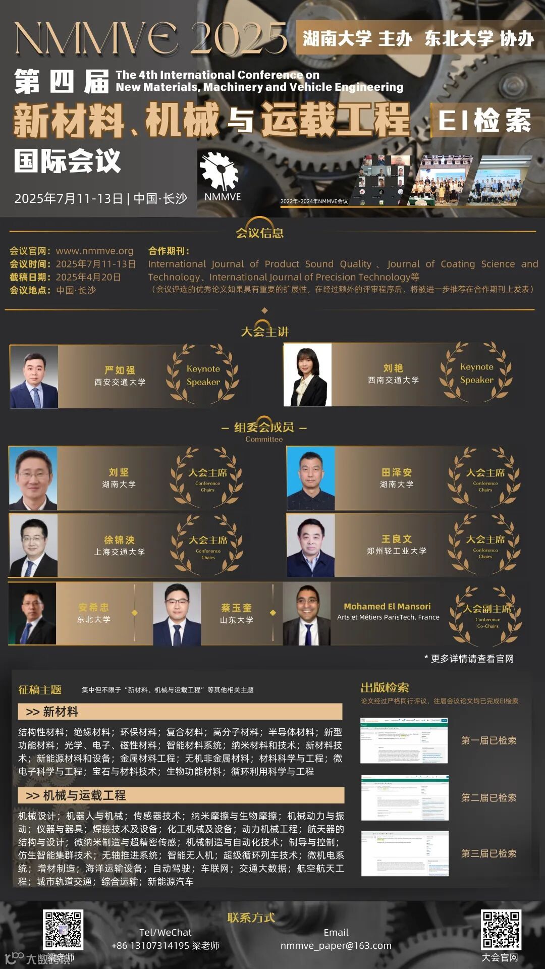 | 第四届新材料、机械与运载工程国际会议 | 2025年7月11日-13日 | 中国·长沙 | 13107314195(微信同) |