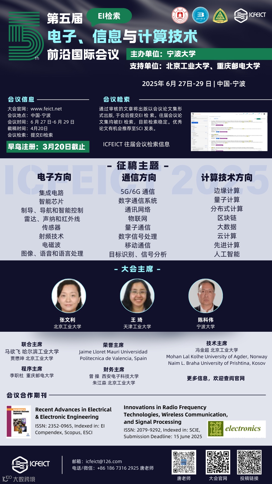 | 第五届电子、信息与计算技术前沿国际会议 | 2025年6月27日-29日 | 中国·宁波 | 18673162925(微信同) |