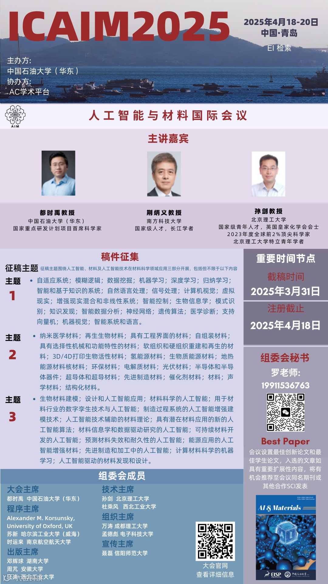 | 第一届人工智能与材料国际学术会议 | 2025年4月18日-20日 | 中国·青岛 | 19911536763(微信同) |