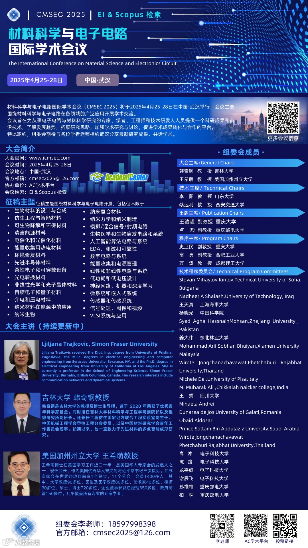 | 第一届材料科学与电子电路国际会议 | 2025年4月25日-28日 | 中国·武汉 | 18597998398(微信同) |