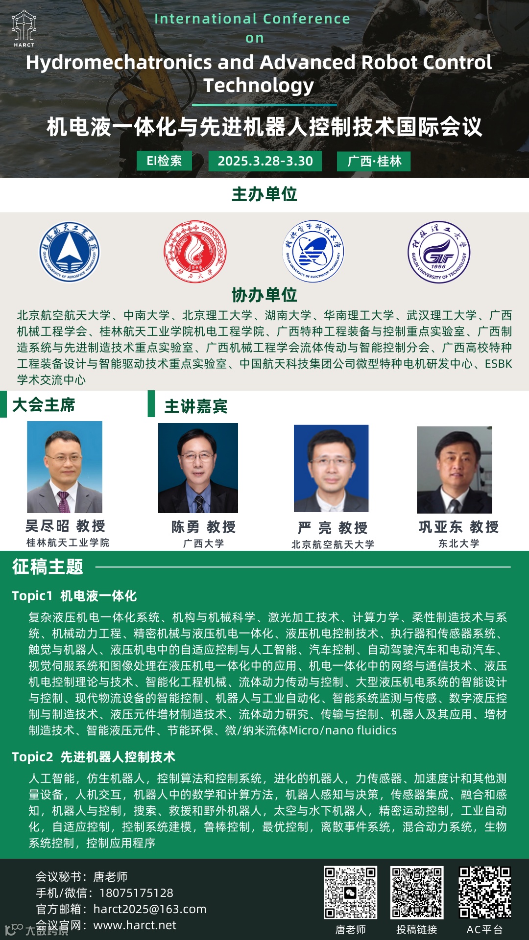 | 第一届机电液一体化与先进机器人控制技术国际学术会议 | 2025年3月28日-30日 | 中国·桂林 | 18075175128(微信同) |