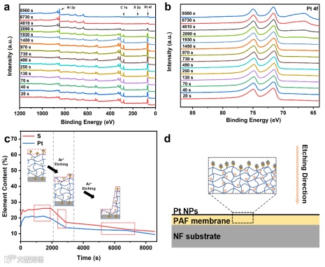 利用Ar+蚀刻技术对Pt@PAF-260-m/NF进行XPS深度剖面分析,以验证Pt在膜电极中的分布状态。如图4a所示,在1930秒之前,XPS谱图中始终可以检测到Ni、C、S和Pt元素。随着Ar+蚀刻时间的增加,Pt 4f峰逐渐向高能区移动(图4b),同时Pt含量逐渐下降(图4c),这表明表面的Pt纳米粒子被逐步蚀刻掉,Pt2+离子是PAF膜中的主要存在形式。Ar+溅射的蚀刻方向如图4d所示,沿此方向形成的膜体系结构如图4c所示。结合UV-vis和XPS光谱的结果,可以证明Pt@PAFs具有增强的导电性,并且Pt均匀分布在PAF膜中。