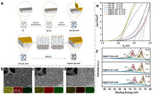 图3. (a) PAF膜电极的制备流程。Pt@PAF-260-m/NF (b)、Pt@PAF-261-m/NF (c)和Pt@PAF-264-m/NF (d)的SEM图像和EDX元素分布图。(e) PAF-260、PAF-261、PAF-264、Pt@PAF-260、Pt@PAF-261和Pt@PAF-264的带隙图。(f) Pt@PAF-260-m/NF、Pt@PAF-261-m/NF和Pt@PAF-264-m/NF膜电极中Pt 4f的XPS光谱。