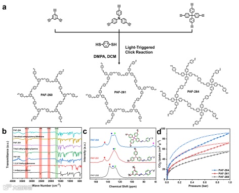 图2. (a) PAF-260、-261和-264的合成策略。PAF-260、-261和-264的红外光谱(b)和13C固体核磁共振光谱(c)。(d) 195 K时PAF-260、-261和-264的CO2吸附-脱附等温线。