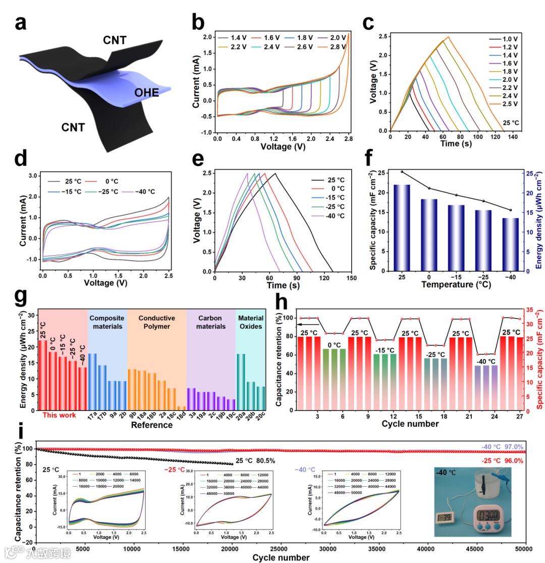 图3. 水失活的OHE电化学性能测试。a) 柔性超级电容器结构示意图;b) AFSC-4.5在不同电压范围下的CV曲线;c) 不同电压下的GCD曲线;不同温度下的d) CV和e) GCD曲线;f) 温度对比电容和能量密度的影响;g) 与同类电容器的能量密度对比;h) AFSC-4.5在变化温度时的容量保留率;i) 循环稳定性。
