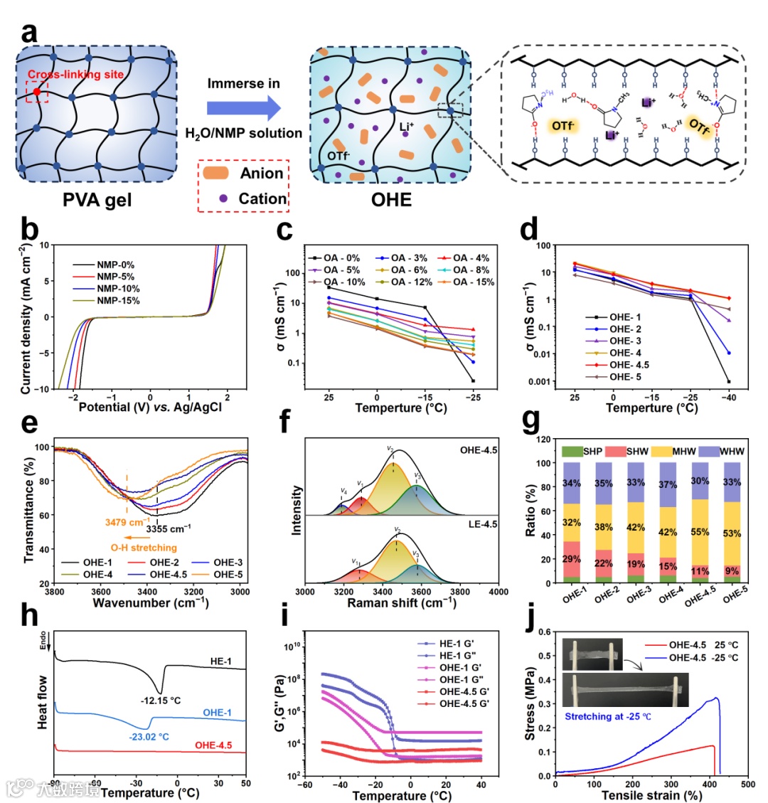 图2. NMP参与的分子间相互作用对凝胶电解质耐低温性能的影响。a) 凝胶电解质的制备;b) 不同NMP 含量对电化学稳定窗口的影响;c) 不同 NMP含量的凝胶电解质的离子电导率;d) 不同 LiOTf 浓度的OHEs的离子电导率;e) OHEs 在 3800–2965 cm−1 区域的红外光谱;f) LE-4.5 和 OHE-4.5 在 3000–4000 cm-1的拉曼光谱及分峰拟合;g) OHE 中水分子的氢键相互作用比例;h) HE-1、OHE-1 和 OHE-4.5的 DSC 曲线;i) 凝胶电解质的储存模量(G′)和损耗模量(G′′);j) OHE-4.5在不同温度下的拉伸性能曲线。