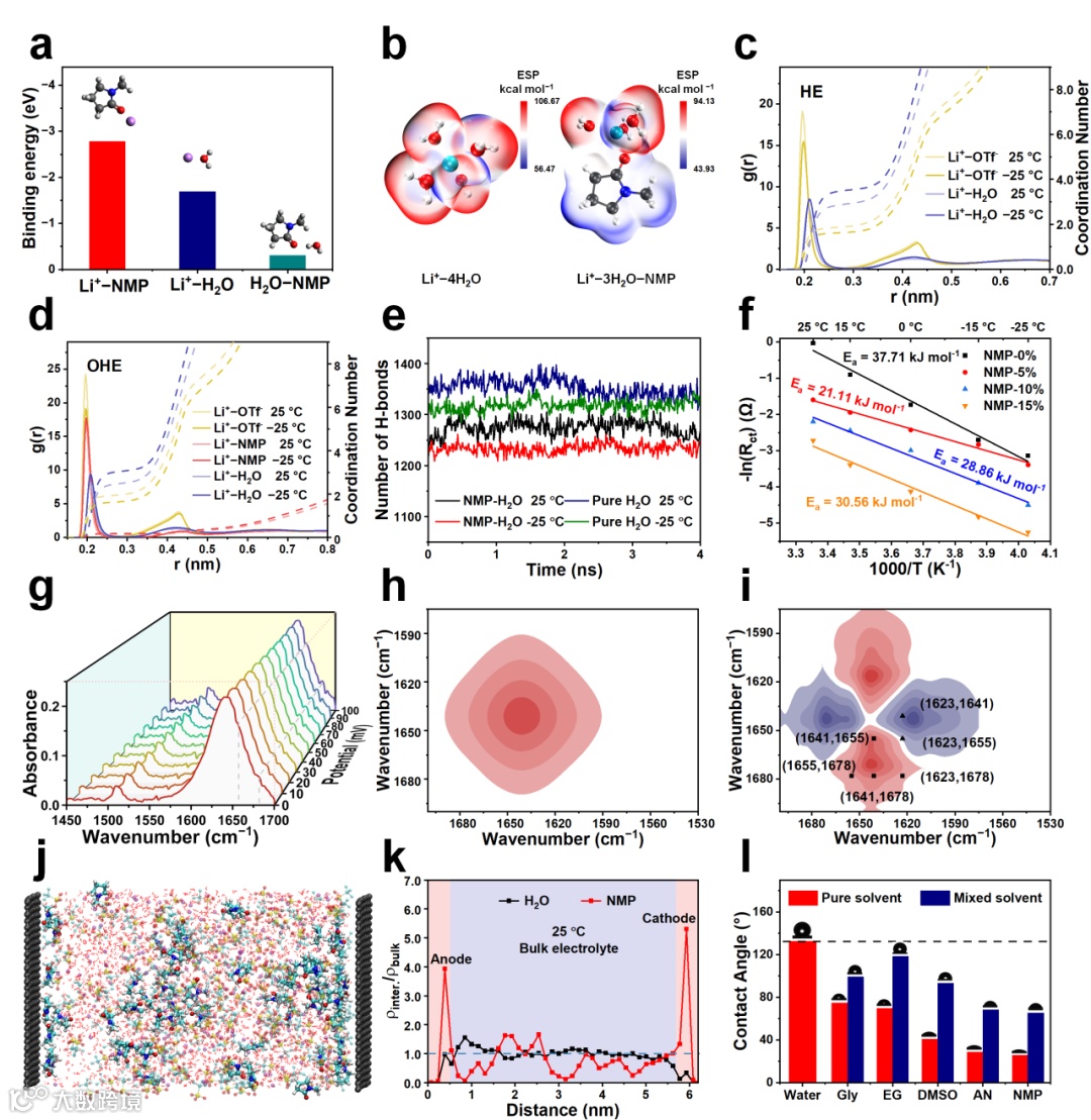 图4. NMP拓宽AFSC输出电压的机制。a) 分子间的结合能及相应结构;b) 简单溶剂化结构模型的静电势;c) HE和d) OHE 模型中Li+–O相关的径向分布函数和配位数;e) 不同温度下两种体系中水分子之间的氢键数;f) 不同NMP含量下电解质的去溶剂化自由能;g) 电压扰动下的原位傅立叶变换红外光谱;NMP 在 1600–1680 cm-1 区域的h) 同步和i) 异步二维相关光谱;j) 具有电压时含有电极的分子动力学模型模拟结果;k) 25 °C 时NMP和 H2O的密度分布;l) 与水混合前后不同溶剂在电极表面的接触角。
