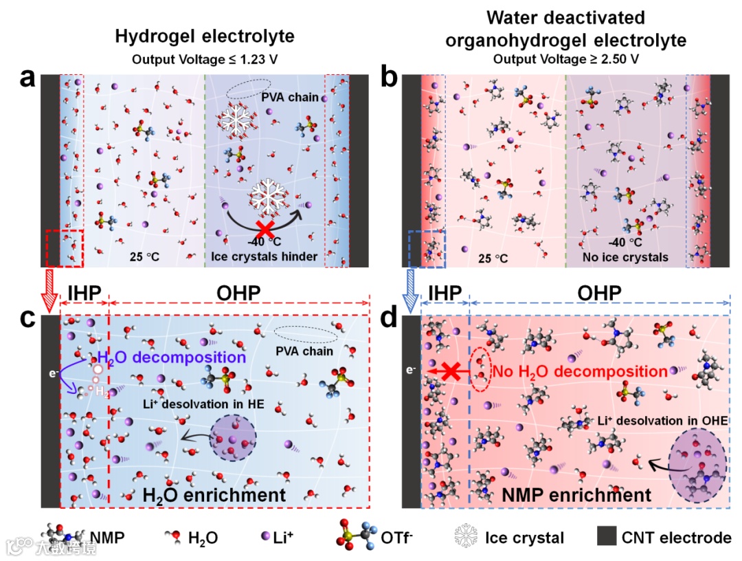 图1. 宽输出电压和耐低温凝胶电解质的设计策略。分别在 25 °C 和 −40 °C 温度下,a) 水凝胶电解质(HE)内部分子相互作用的示意图;b) 水失活 OHE 中内部分子相互作用的示意图。在外亥姆霍兹面(OHP)和 IHP 处,c) HE 和 d) OHE 分别的去溶剂化及特异性吸附过程。