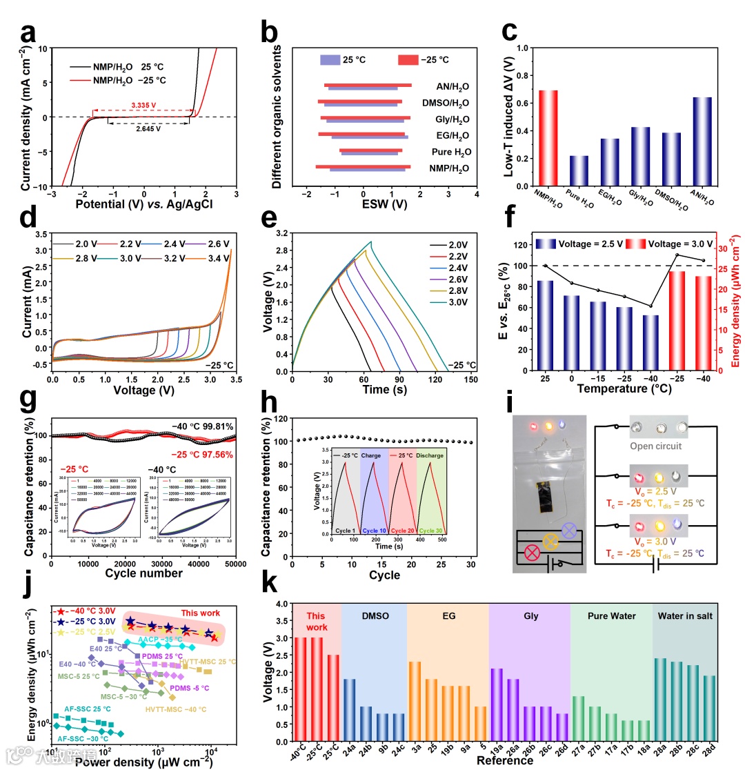 图5. 低温对AFSC-4.5电化学性能的提升。a) 含NMP电解液在不同温度下的LSV曲线;b) 常温和−25°C下不同添加剂的ESW对比;c) 低温引起的电压窗口变化;d) −25°C下2.0–3.4V电压范围的CV曲线;e) −25°C下2.0–3.0V电压范围的GCD曲线;f) 1.0 mA/cm²电流密度下的能量密度保留率;g) −25°C和−40°C的循环稳定性;h) −25°C充电、25°C放电切换30次后的容量保留率;i) AFSC-4.5点亮三个并联的LED;j)同类水系凝胶电解质超级电容器的Ragone性能对比;k) AFSC-4.5在−40°C至25°C的最大输出电压。
