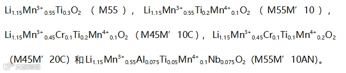 同样的固相法合成了锰含量更高且无杂质相的Li1.15Mn3+0.55Ti0.1Mn4+0.2O2 (M55M’20)阴极,形貌粒径与上述五种DRX阴极相一致。并且电化学显示其既具有高容量,又有稳定的循环寿命。在20 mA g–1电流密度下容量可达289 mAh g–1,1.5–4.8 V电压区间100次循环后的比容量为204 mAh g–1,(553 Wh kg–1)。