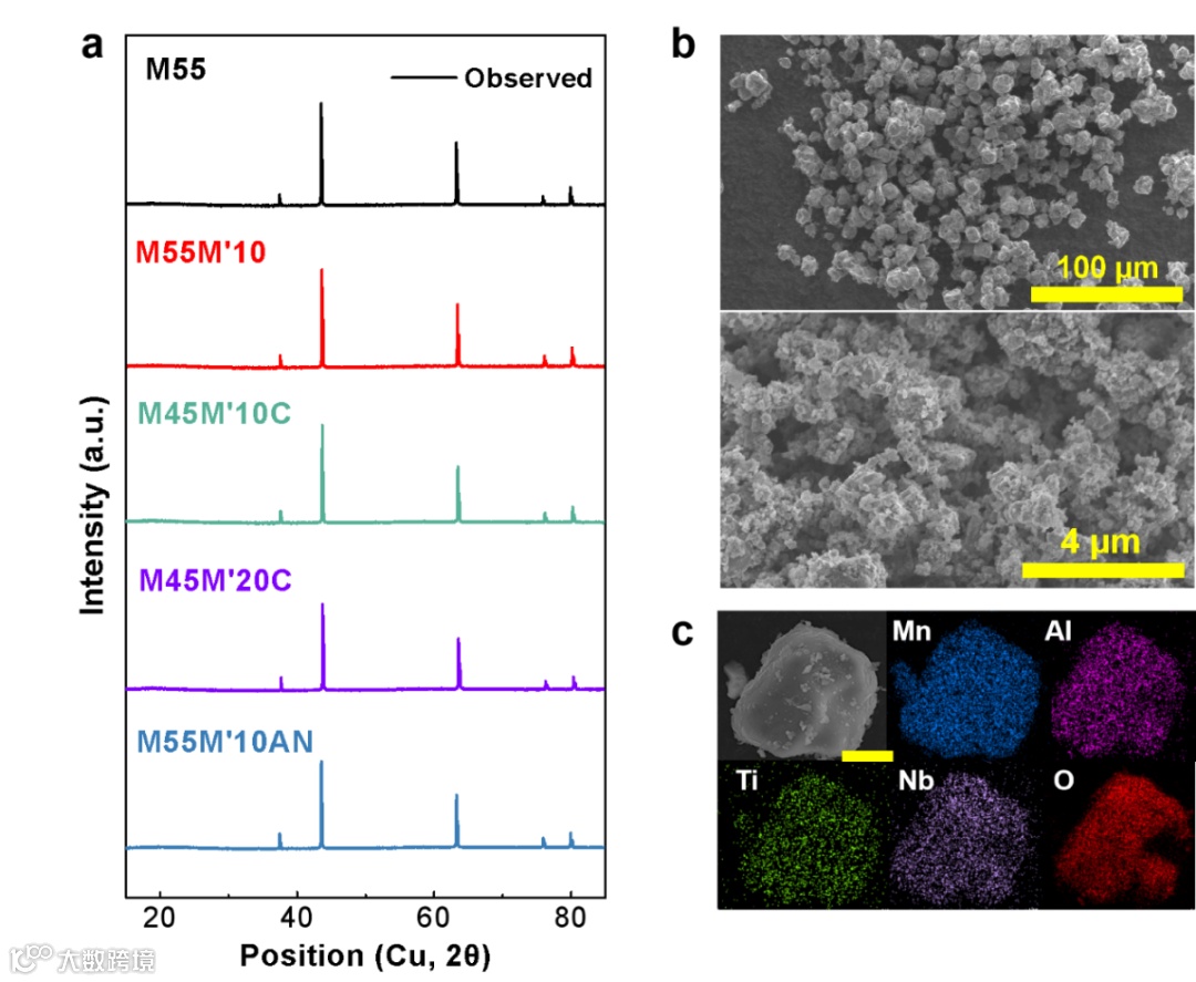 图2. 系列DRX阴极的结构表征。(a)XRD谱图;(b)与C65研磨前(上图)后(下图)M55M’10AN阴极的SEM图像;(c)研磨前M55M’10AN的SEM和EDS图像(标尺:4 μm)。