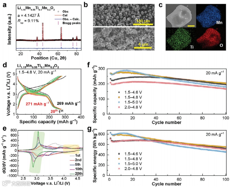 图6. (a)XRD精修谱图;(b)与C65混合研磨前(上图)后(下图)的SEM图像;(c)SEM/EDS图像(标尺:4 μm);(d)前20次循环的电压-比容量曲线;(e)第1、第2、第5、第10和第20次循环的dQ/dV曲线演化;不同电压区间内100次循环的比容量(f)和比能量(g)保持图。