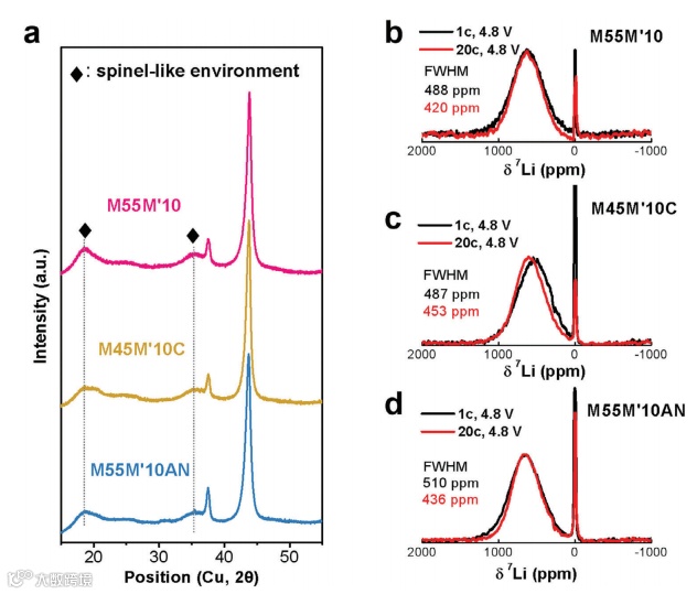 图5. (a)M55M’10,M45M’20和M55M’10AN阴极的非原位XRD谱图;(b)M55M’10,(c)M45M’20和(d)M55M’10AN电极首次及第20次循环后的7Li ssNMR谱图。