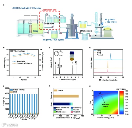 在小规模中试实验中,利用γ-Ni(Co)OOH催化剂和OER活化方法,成功实现了THIQ氧化为DHIQ的连续生产。实验表明,经过120次循环后,电流稳定性超过98%,产物的选择性和法拉第效率均保持在95%以上。通过NMR光谱和色谱分析,验证了最终产物的纯度和选择性。此外,经济分析显示,该工艺的生产成本为264美元/公斤DHIQ,年盈利能力可达24.4万美元,具备良好的商业化潜力。小规模中试实验的成功验证了该方法的可行性和工业化应用前景。