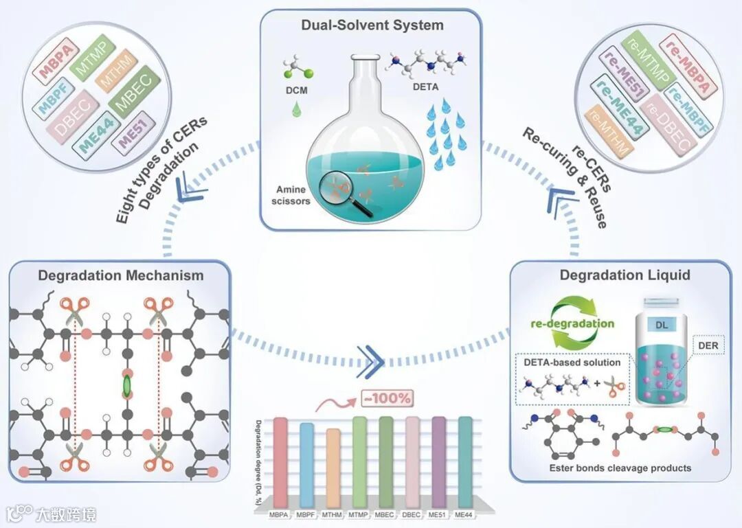 研究团队创新性地提出双溶剂反应系统(二氯甲烷+二亚乙基三胺),通过溶剂间原位生成的多种胺类化合物形成“胺剪刀”,在温和条件(≤150℃)下精准剪断环氧树脂中的酯键,实现高效降解: