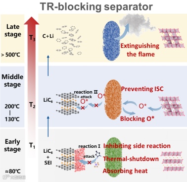 锂电池热失控(TR)风险对其广泛应用构成了重大挑战,尤其在电动汽车和大规模储能领域的影响更为突出。作为电池正负极之间的关键屏障,隔膜在抑制活性材料焦耳热生成方面发挥着不可替代的作用,是确保电池安全性能的核心组件。随着对TR机制研究的深入,研究发现电池内部多种放热反应均与隔膜特性密切相关。因此,开发具有TR阻断功能的隔膜被视为缓解热失控问题的关键策略。然而,由于这些放热反应与TR之间的作用机制尚未完全阐明,导致功能性隔膜的针对性设计面临诸多挑战。