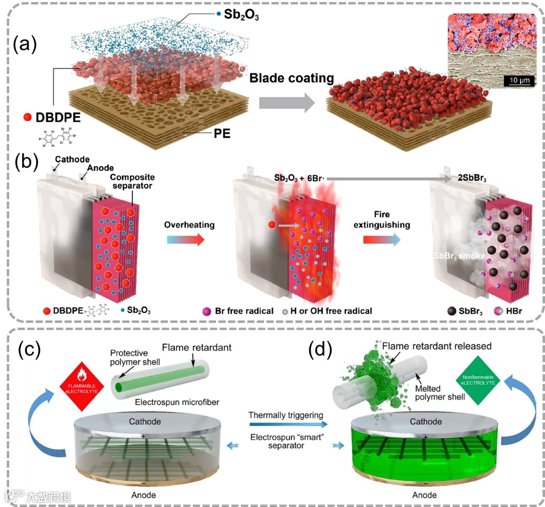 在热失控的后期,热量的主要来源包括带电电极与电解液反应生成的可燃性气体以及电解液自身的燃烧。虽然通过在电解液中引入阻燃剂能够提升电池安全性,但为实现电解液的完全不可燃特性往往需要添加大量阻燃剂,这可能导致电解液离子电导率的下降,进而劣化电化学性能。将阻燃功能组分整合至隔膜基体中可有效协调阻燃性能与电化学性能的平衡。