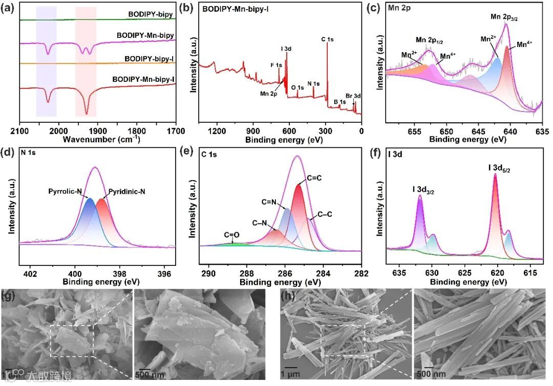 图 3. (a) BODIPY-Mn-bipy-I(红色)、BODIPY-Mn-bipy(紫色)、BODIPY-bipy-I(橙色)和 BODIPY-bipy(绿色)的傅立叶变换红外光谱。(b) BODIPY-Mn-bipy-I 的 (c) Mn 2p、(d) N 1s、(e) C 1s 和 (f) I 3d 的 X 射线光电子能谱 (XPS) 和高分辨率 XPS 光谱。BODIPY-Mn-bipy-I (g) 和 BODIPY-Mn-bipy (h) 的扫描电镜图像。