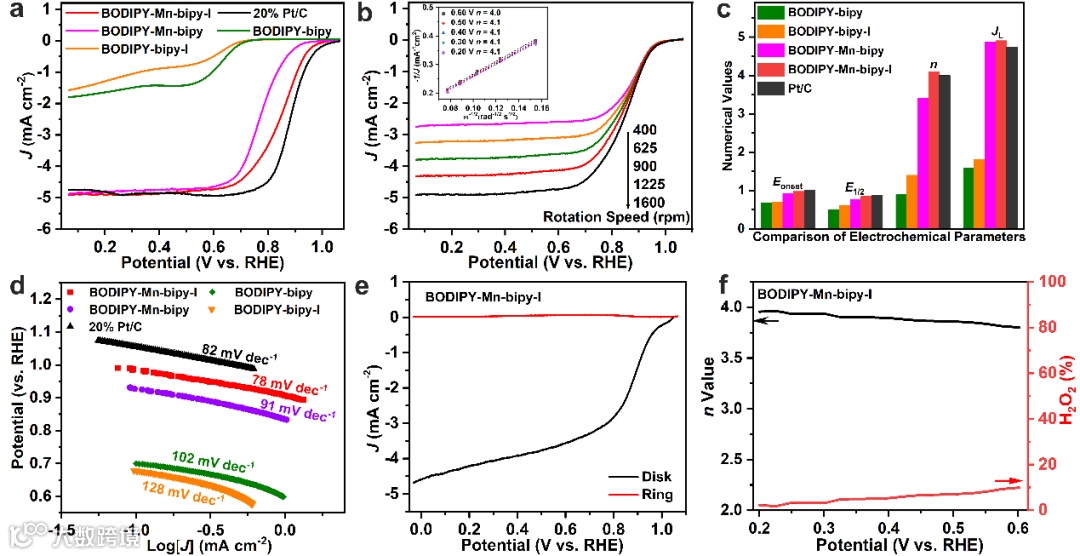图 4. (a) BODIPY-bipy、BODIPY-bipy-I、BODIPY-Mn-bipy、BODIPY-Mn-bipy-I 和 20% Pt/C 在氧气饱和的 0.1 M KOH 溶液中的 LSV 曲线,RDE 电极转速为 1600 rpm。(b) BODIPY-Mn-bipy-I 在不同转速下的极化曲线。插图为K-L图。(c) BODIPY-bipy、BODIPY-bipy-I、BODIPY-Mn-bipy、BODIPY-Mn-bipy-I 和 20% Pt/C 在 0.5 V 和 JL 下的起始电位(Eonset)、半波电位(E1/2)和电子转移数(n)。(e)BODIPY-Mn-bipy-I 在氧气饱和的0.1 M KOH溶液中的旋转环盘电极(RRDE)实验。(f) BODIPY-Mn-bipy-I 的总氧还原产物中过氧化物的百分比和电子转移次数。